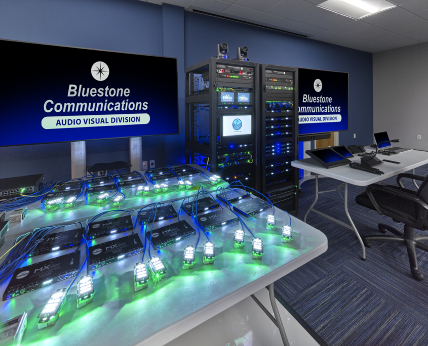 Bluestone Communications’ Audio Visual Integration Services Team has a dedicated 10,000 square foot Audio Visual Office in Malvern, PA, with Avixa-certified staff (including CTS, CTS-I and CTS-D Certifications), and Manufacturer Partnerships including Extron, QSC, Crestron, BiAmp, Cisco, Logi, and more.